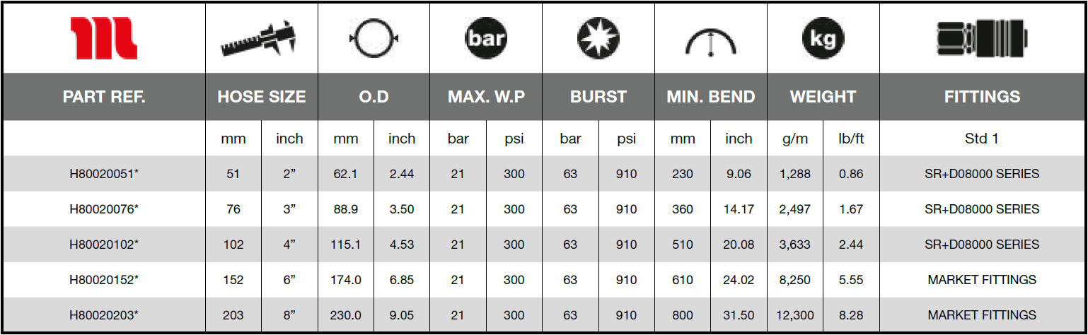 | CONTINUOUS SERVICE TEMPERATURE RANGE -30 °C, -22 °F 90 °C, 194 °F TUBE NBR rubber, abrasion resistant, thick tube REINFORCEMENT COVER APPLICABLE SPECS STANDARD PACKAGING |